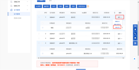 寄回续签:费用为249元,可将实体数字证书寄回平台并下载寄回续签订单,由平台工作人员完成续签后寄回,一般收到寄回实体数字证书两个工作日可平台工作人员完成续签并寄出。特点:操作难度低,建议对电脑不熟悉的用户通过寄回续签。寄回续签地址:(证书寄回地址:北京市海淀区紫竹院路车道沟10号院科技一号楼 收件人:秦经理 收件电话:18810966015(仅接收快递,请勿拨打)